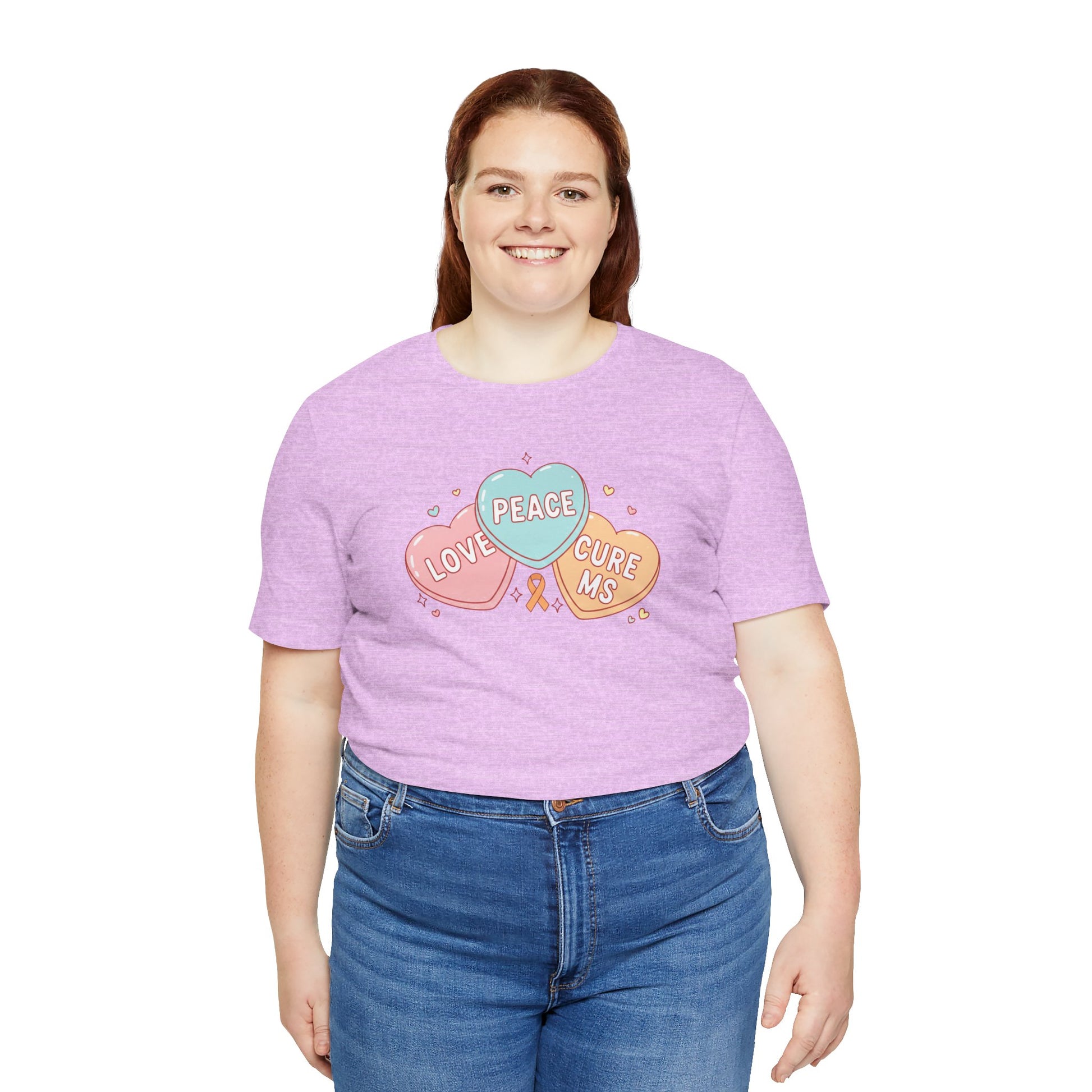 Meaningful Design: Features three candy hearts with "Love," "Peace," and "Cure MS" centered around the orange MS awareness ribbon.