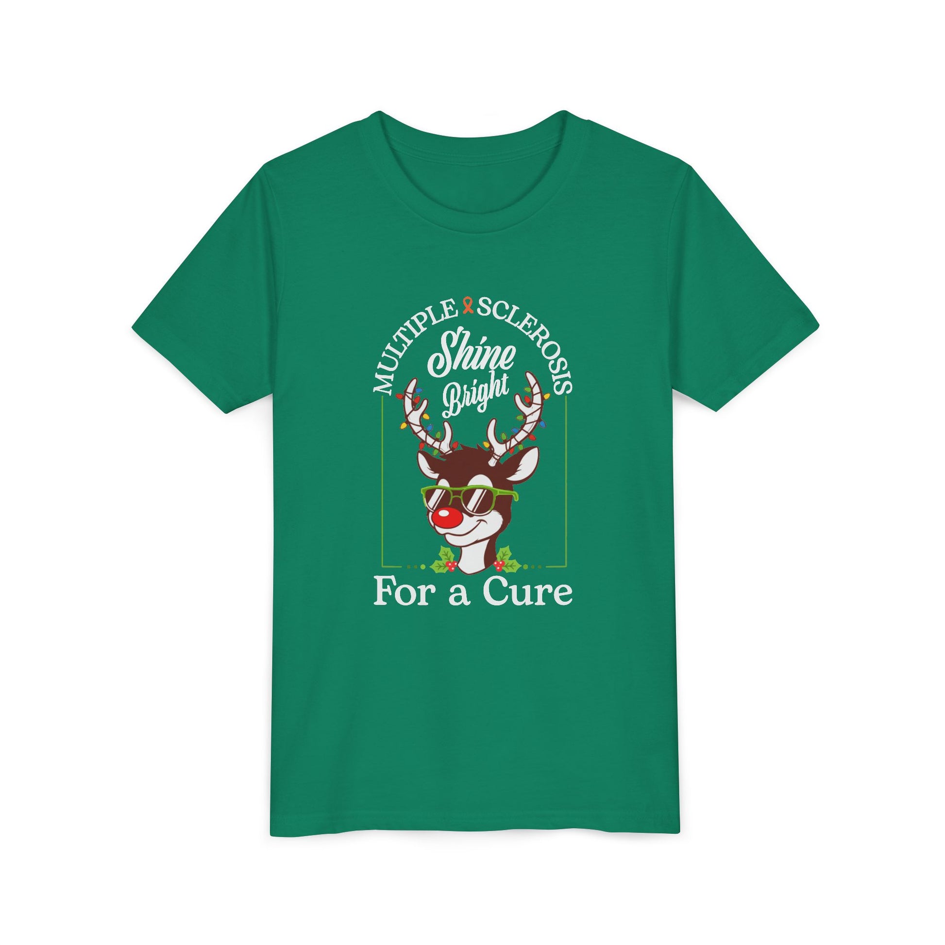 Youth 'Shine Bright For a Cure' Multiple Sclerosis Awareness Holiday Tee. This festive red t-shirt features a cool reindeer wearing sunglasses and Christmas lights on its antlers, alongside the inspiring message 'Multiple Sclerosis Shine Bright For a Cure'. Perfect for spreading awareness during the holiday season.
